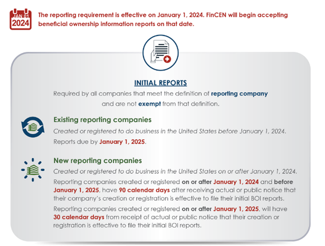 FinCEN的這一要求于2024年1月1日生效,除非屬于豁免情形或不適用情形,今年在美國(guó)新設(shè)或登記經(jīng)營(yíng)的企業(yè)需要在90日內(nèi)向FinCEN提交BOI報(bào)告,今年之前已經(jīng)在美存續(xù)或登記經(jīng)營(yíng)的企業(yè)需要在2025年1月1日前向FinCEN提交BOI報(bào)告。