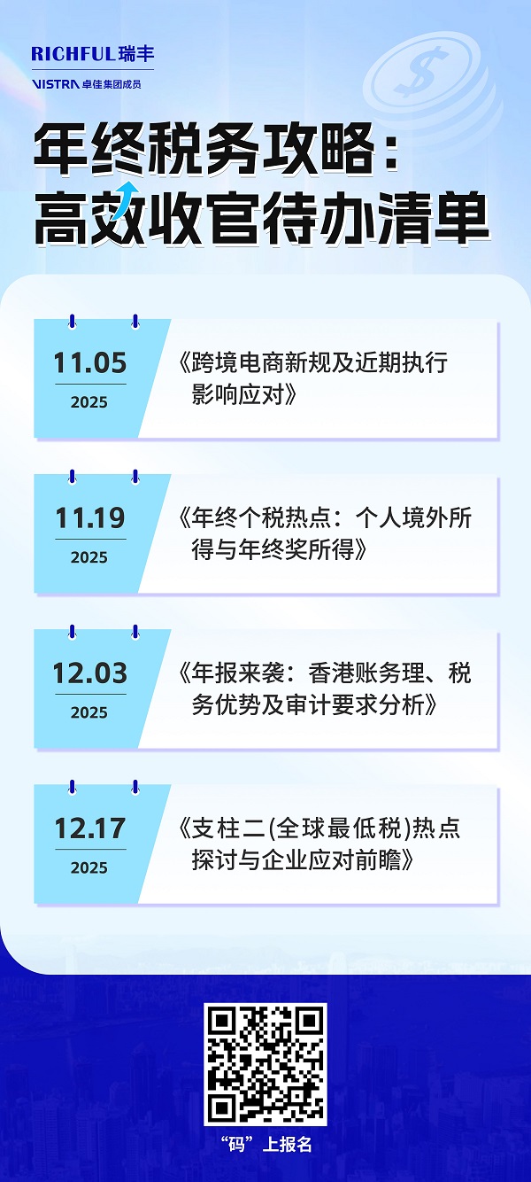 歲末將至,面對紛繁復(fù)雜的稅務(wù)政策與緊迫的年度收官工作,您是否正在尋求一份清晰高效的行動(dòng)指南?我們精心策劃 “年終稅務(wù)攻略:高效收官待辦清單”系列網(wǎng)絡(luò)研討會(huì),直擊四大關(guān)鍵議題,助您系統(tǒng)梳理合規(guī)路徑,優(yōu)化財(cái)稅布局,為2025年的穩(wěn)健發(fā)展奠定堅(jiān)實(shí)基礎(chǔ)。