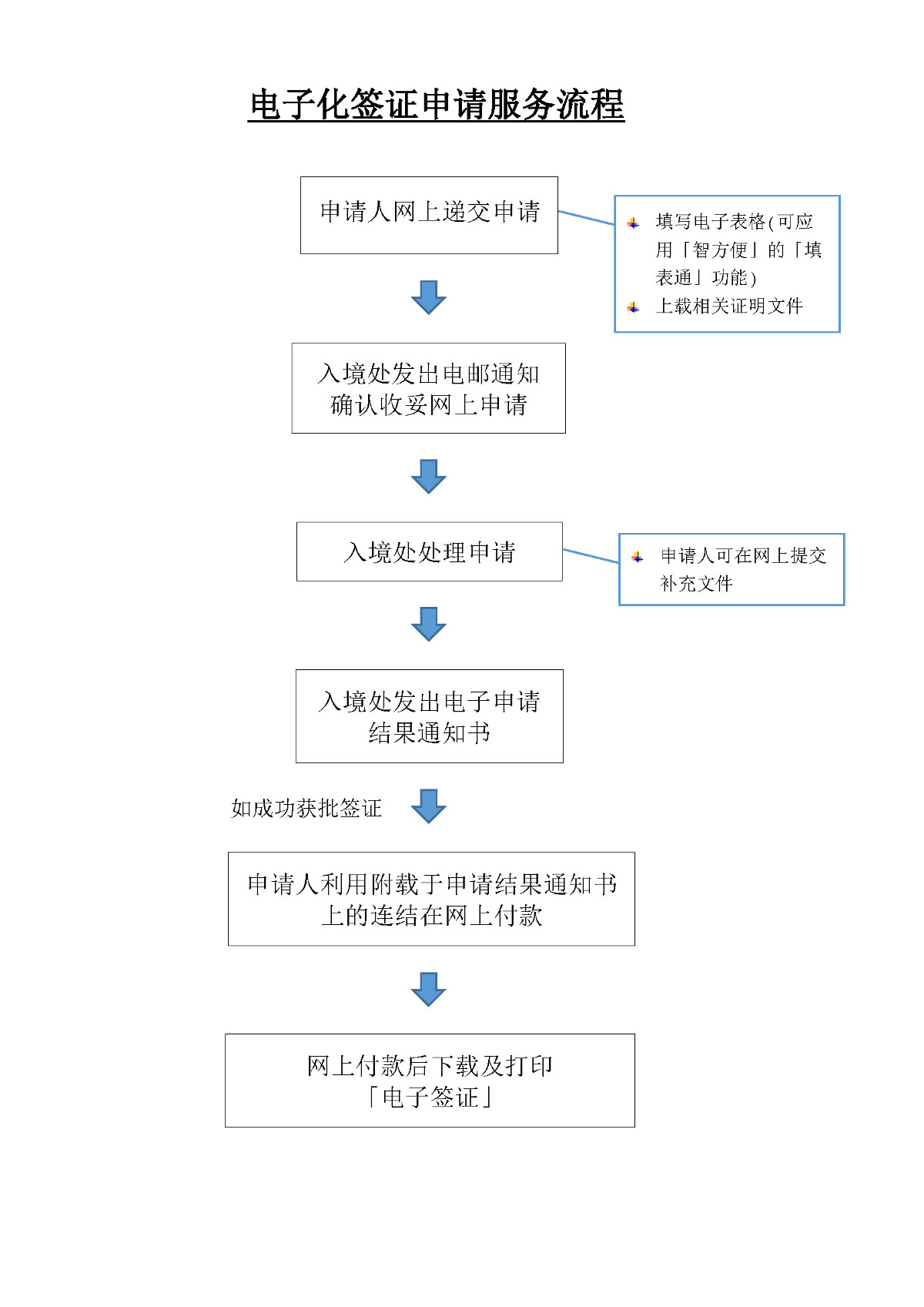符合條件的申請人無需親身前往入境處辦事處,而可在網(wǎng)上完成整個申請程序,包括通過入境處流動應(yīng)用程序、入境處網(wǎng)站或香港政府一站通網(wǎng)站遞交簽證,于申請獲批后通過網(wǎng)上付款程序繳納相關(guān)費用,并在繳費成功后即時下載“電子簽證”,以PDF形式儲存于個人流動設(shè)備中或進行打印。