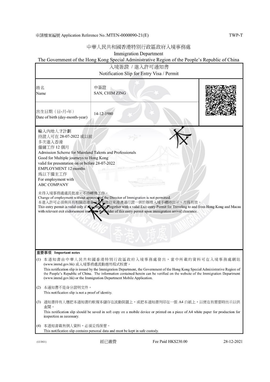 「電子簽證」載有加密二維碼供核實該證之用。有關(guān)人士(例如「電子簽證」持有人的準雇主)可使用入境處流動應(yīng)用程式掃描該二維碼檢視相關(guān)資料。使用其他相機裝置或流動應(yīng)用程式掃描該二維碼將無法檢視相關(guān)資料。此外,有關(guān)人士亦可在香港政府一站通網(wǎng)站或入境處流動應(yīng)用程式(APP)輸入「電子簽證」資料,以核實該證。