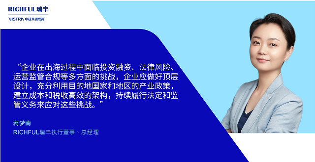 除了金融服務(wù),企業(yè)出海還需考慮多方面因素。RICHFUL瑞豐執(zhí)行董事、總經(jīng)理蔣夢(mèng)南與《中國(guó)經(jīng)營(yíng)報(bào)》記者分享,企業(yè)在出海過(guò)程中面臨投資融資、法律風(fēng)險(xiǎn)、運(yùn)營(yíng)監(jiān)管合規(guī)等多方面的挑戰(zhàn),企業(yè)應(yīng)做好頂層設(shè)計(jì),充分利用目的地國(guó)家和地區(qū)的產(chǎn)業(yè)政策,建立成本和稅收高效的架構(gòu),持續(xù)履行法定和監(jiān)管義務(wù)來(lái)應(yīng)對(duì)這些挑戰(zhàn)。